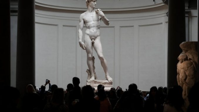 Turiștii, mulți dintre ei americani aflați în vacanță sau care studiază în străinătate, s-au pozat pentru selfie-uri în fața uriașei statui de marmură, care îl înfățișează pe biblicul David, dezbrăcat, cu o praștie pe umăr și o piatră în mână, gata de luptă cu Goliat.