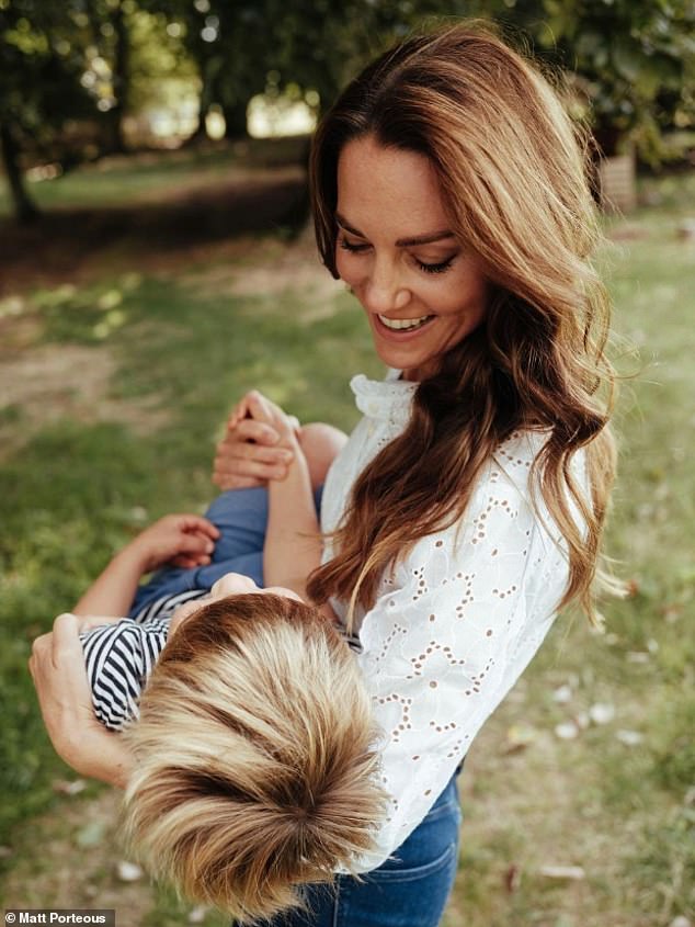 Fotografia o arată pe Kate cu Prințul George, în vârstă de nouă ani, Prințesa Charlotte, în vârstă de șapte ani și Prințul Louis, în vârstă de patru ani, stând într-un copac și zâmbind la cameră.