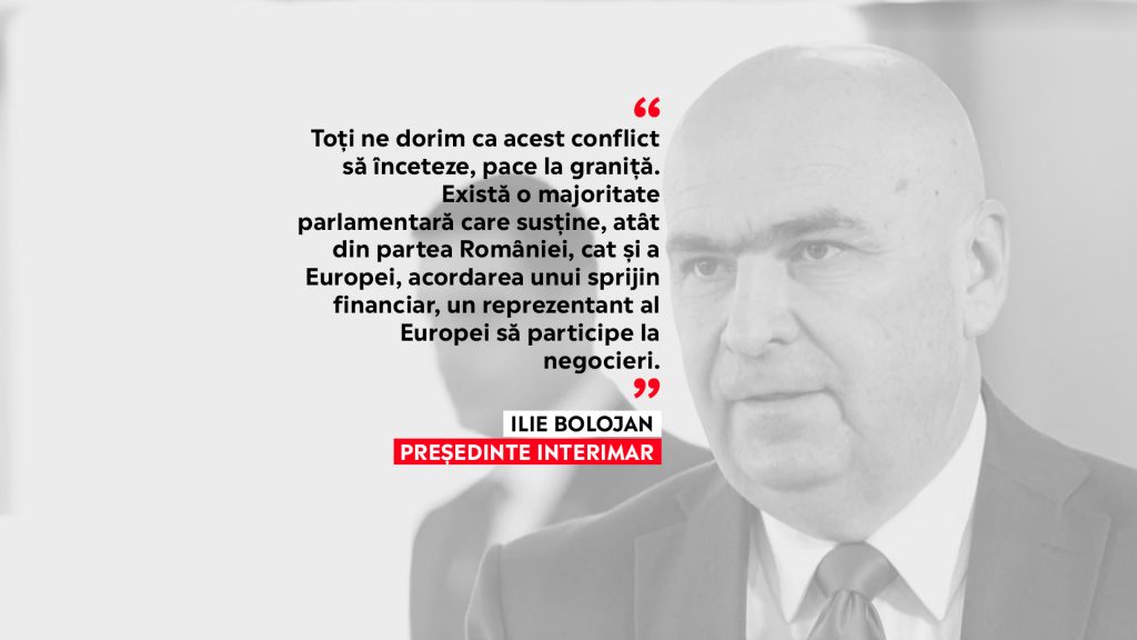 „Dacă Rusia va continua. Ucraina poate să fie doar prima victimă. Este o susținere pentru securitatea țării noastre. Toți ne dorim ca acest conflict să înceteze, pace la graniță. Există o majoritate parlamentară care susține, atât din partea României, cât și a Europei, acordarea unui sprijin financiar, un reprezentant al Europei să participe la negocieri. Ne-am dezvoltat ca țară pentru că s-au respectat două condiții: am fost o țară sigură, datorită scutului NATO și am beneficiat de apartenența la UE. Am acceptat alături de țările europene să își asigure un rol mai important în apărarea continentului. Este important să avem o stabilitate politică și una guvernamentală. România, dacă se va lua o decizie la nivelul UE, va trebui într-o anumită formă să susțină acest lucru”, a spus Ilie Bolojan.