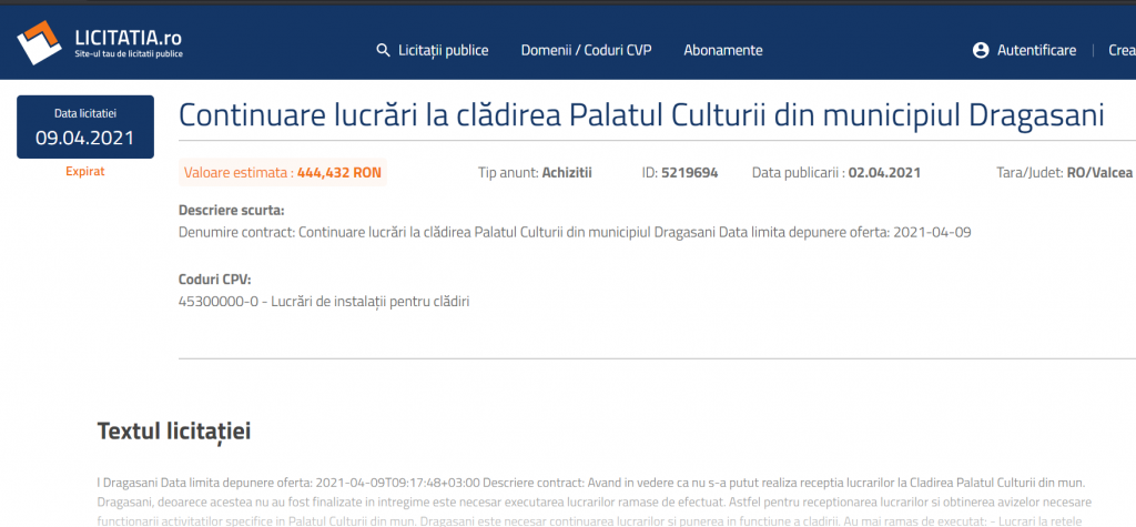 La începutul lunii aprilie 2021, pe un site de licitație publică, s-a făcut o ofertă cu o valoare de 444, 432 RON pentru continuarea lucrărilor la Clădirea Palatul Culturii din municipiul Drăgășani.