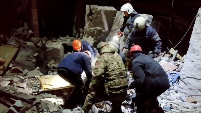 Ministerul pentru Situații de Urgență publicase sâmbătă târziu o înregistrare video în care primii respondenți găseau cadavre și scoteau persoane însângerate pe targă din ruinele clădirii cu un etaj care părea distrusă.