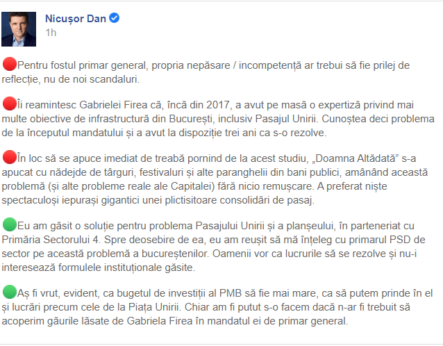 Gabriela Firea îl acuză pe primarul Capitalei, Nicuşor Dan, că „nu e în stare să construiască nimic şi preferă să arunce la sectoare marile lucrări de investiţii”. În replică, Nicușor Dan a publicat câteva rânduri pe Facebook prin care îi transmite Gabrielei Firea că a găsit dezastru în Primăria Capitalei atunci când a preluat funcția.