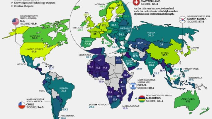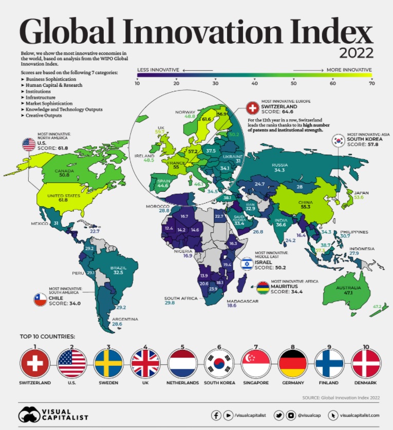 Clasamentul e condus de Elveția, ale cărei reguli de proprietate intelectuală sunt considerate de clasă mondială. Estonia, o țară cu doar 1,3 milioane de locuitori, este pe locul 18, peste Norvegia, Noua Zeelandă sau Belgia. Statul baltic a devenit cea mai avansată societate digitală a planetei după ce guvernul a alocat sume imense pentru programe și scheme de dezvoltare a antreprenorilor și companiilor start-up. Spre comparație, România are cele mai mici alocări din UE pentru sectorul cercetare și dezvoltare.