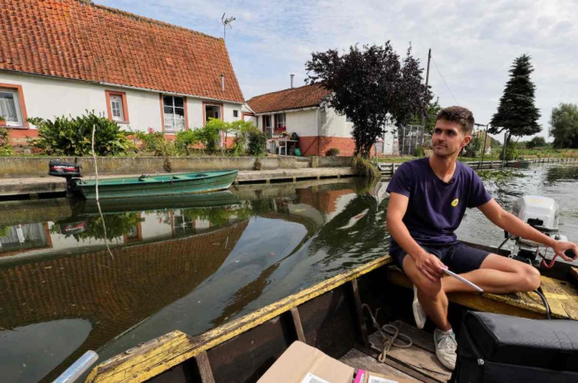 Charles Defoort în vârstă de 24 de ani merge din ușă în ușă cu o barcă cu motor din lemn în mlaștinile Audomarois, o regiune situată la aproximativ 45 de minute de mers cu mașina de Dunkerque, în nordul Franței, potrivit presei străine.