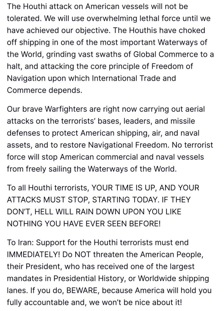 „Houthi au desfășurat o campanie neîncetată de piraterie, violență și terorism împotriva navelor, avioanelor și dronelor americane și ale altor țări. Nicio forță teroristă nu va opri navele comerciale și navale americane să navigheze liber pe căile navigabile ale lumii„, a scris Trump în postarea sa.